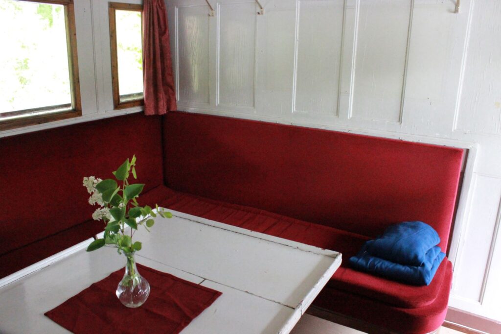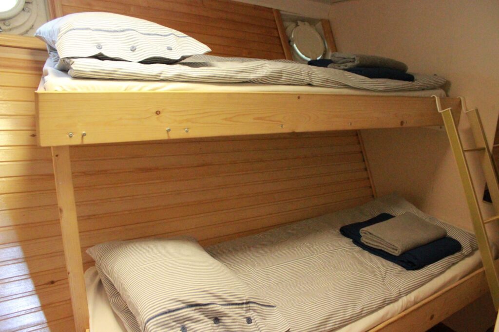 S/S Tarjanteen pehmeässä kyydissä on mahdollista myös nukkua. Aamiainen kuuluu hyttien hintaan mukaan. Pääsimmekin tutustumaan laivan majoitustiloihin kyyppari Schroderuksen esittelemänä, tarjolla on kaksi kahden hengen, yksi yhden hengen ja yksi neljän hengen hyttiä. Hytit ovat pieniä ja pelkistettyjä, mutta samalla varsin söpöjä. Kyllä näiden sinivalkoraitaisten lakanoiden välissä varmasti uni tulisi.