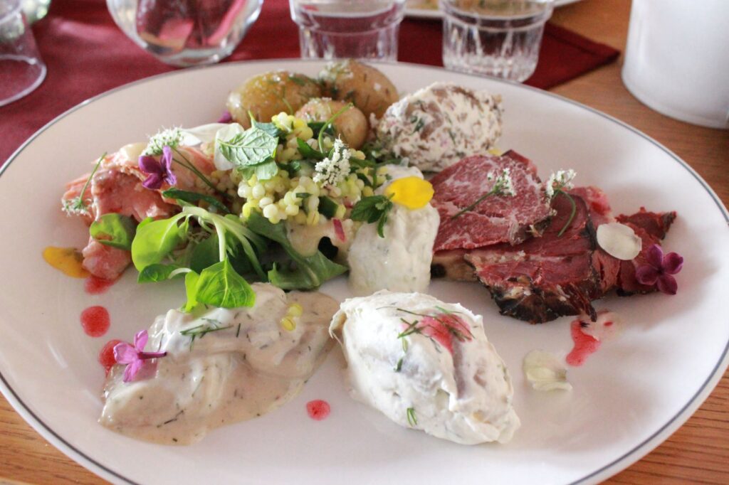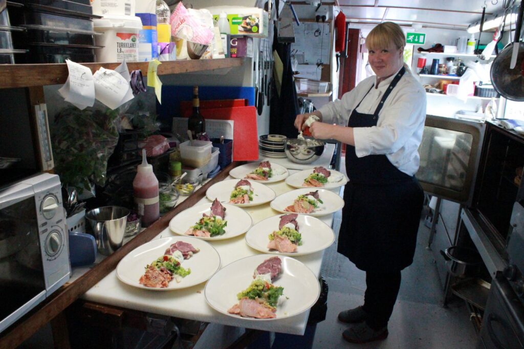 Aikamme maisemia ihasteltuamme siirryimme yläkerran A-oikeuksilla varustettuun ravintolaan. Vuorossa olisi herkutteluosuus laivan erikoisuuden parissa, joka näin juhannuksena oli juhannuslautanen. Kokki Eija Murto kävi pöydissä kertomassa vuodenaikaan sopivasta kalavoittoisen herkkulautasen sisällöstä. Halukkaille oli kyytipoikana myös lipstikkashotti.