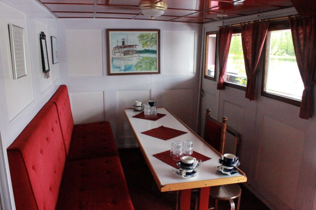 Otimme mukavat ulkopaikat laivan kyljestä, mukana oli meidän lisäksi arvioilta noin 70 risteilymatkustajaa. Laivan koneet käyntiin ja höyrypillin vihellys, joka oli niin kova, että melkein putosimme säikähdyksestä penkeiltämme. Matka Kalettomanlahdesta saattoi alkaa!
