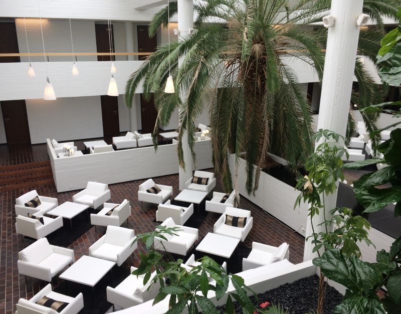 Tilaan mahtuu 120 vierasta. Sisäpuutarha näyttää siltä kuin olisimme siirtyneet muotilehden sivuille tai ulkomaisen hienostohotellin aulaan. En meinannut uskoa silmiäni.