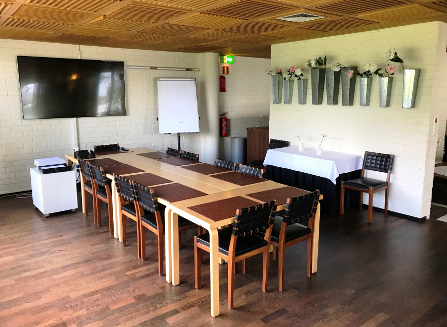 Kierrämme alakerran erilaisia kabinetti-, sauna- ja juhlatiloja. Vaikka puitteet ovat modernit, ovat tilat muunneltavissa tapahtuman ilmeen mukaisesti. Myös erikokoisia huoneita on pienistä suuriin, joten useampi kuin yksi tilaisuus onnistutaan pitämään samanaikaisesti.