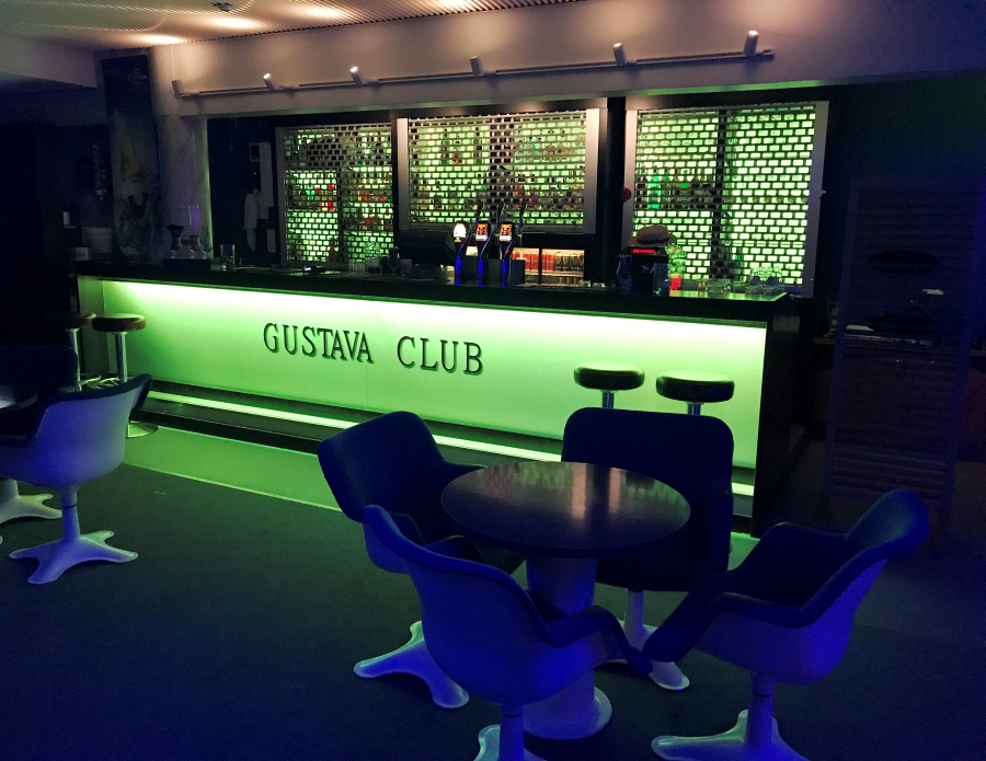 Mutta takaisin Gustava clubille… Astumme ajassa taaksepäin 70-luvun ruotsinlaivalle. Peilipallot katossa, klubissa odottavat Kukkapuron aidot karusellituolit sekä pöydät istujaansa. Wou! Ihme ettei televisio- ja elokuvatuotantoryhmät ole tätä aarretta löytäneet. Fiilis on aivan mieletön. Korvissa alkaa soida heti Abban parhaat, ja tekisi mieli tehdä muutama tanssimuuvi sini-punaisissa värivaloissa… Tässä ravintolassa on muuten säilynyt suurin yhtenäinen Kukkapuron suunnittelema karusellituoliryhmä. Näitä settejä kun vielä pari vuosikymmentä sitten heitettiin roskalavalle aivan surutta.