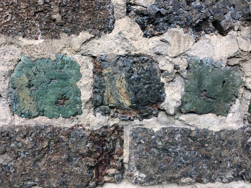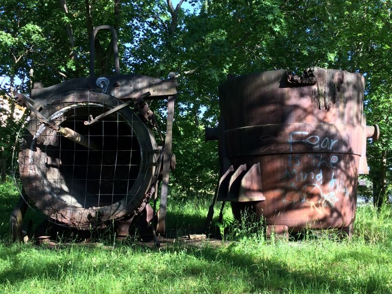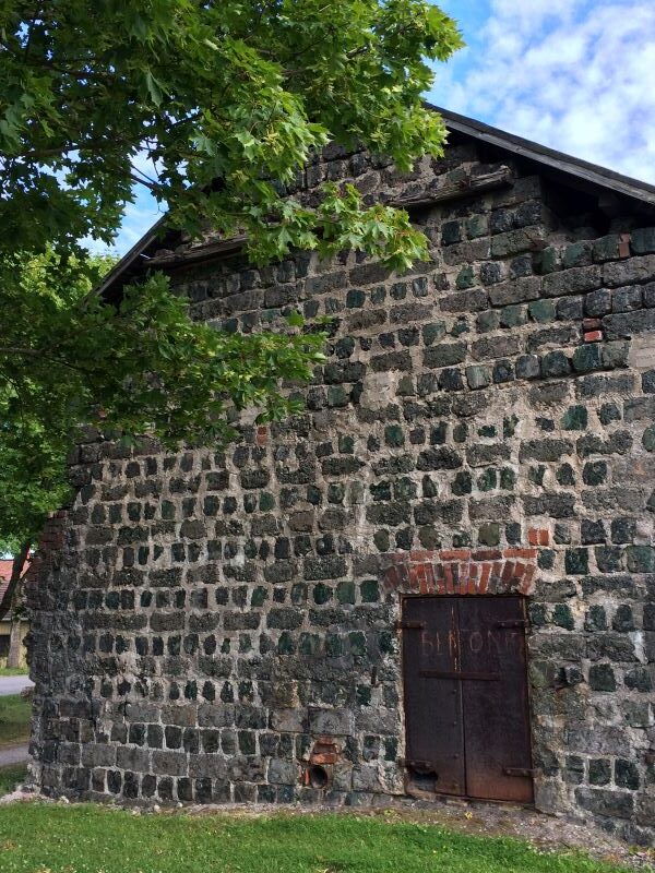 Kävelemme hiiliuunien vieressä, myös näihin rakennuksiin on käytetty kuonatiiltä, joka on itse asiassa aika hienoa materiaalia. Mustaa tiiltä, jossa on kiiltävää, uunin valtavissa lämpötiloissa tiivistynyttä lasiaista.