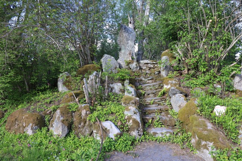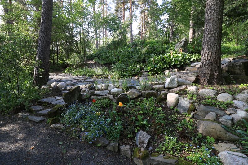 Puistossa on paljon erilaisia luonnonkiveyksiä, kiviaskelmia ja myllykiviä. Selkeät polut kulkevat puiden siimeksessä ja muutama penkki kutsuu nauttimaan puiston annista hieman pidempään.